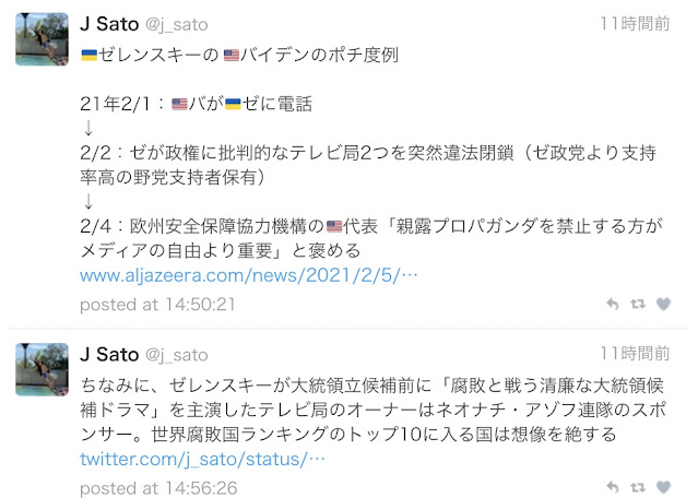 ところでこういう情報に行き当たったんだけど、どうだい? 信憑性を自ら調べてみたら。ボクは半日ほどかかって先のほうはテレビ局2つじゃなくて3つのーーZIK, NewsOne, and 112 Ukraineーー違法閉鎖なのがわかったけど、ネオナチのアゾフ連隊のほうはまだわかんないや。 |