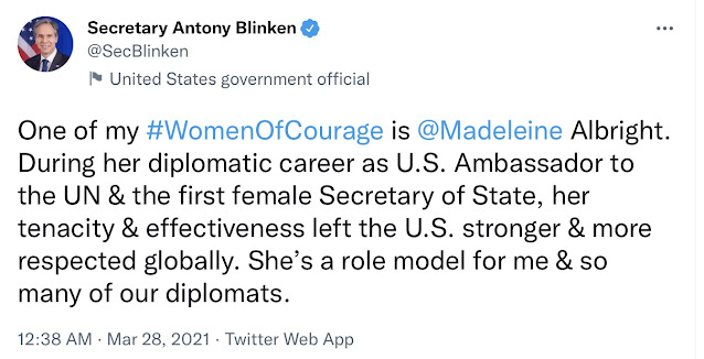 ブリンケン)私の「勇気の女たち」の一人はマドレーヌ・オルブライトです。国連大使、そして女性初の国務長官としての外交キャリアにおいて、彼女の粘り強さと有効性は、米国をより強く、より世界的に尊敬される存在にしました。彼女は私や多くの外交官のロールモデルです。(ツイッター、2021年3月28日) |