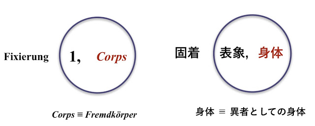 注意しなければならないのは、固着としての身体の出来事は、厳密に言えば、単に現実界的シニフィアンではなく、一者のシニフィアンと身体の結びつきであり、言い換えれば、固着には表象的要素と身体的要素がある。 |