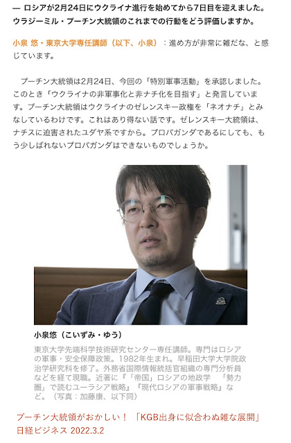 これは「転向」というレベルの話じゃないな。背後で何らかの力が働いて、ウクライナ応援への世論誘導プロパガンダ要員として何者かが小泉悠を選抜した、と「憶測」するほかないね。私はこの「背後」についてもいくらかの観点があるのだがーーおそらくウクライナ応援団として終始している国際政治学者たちの動向を少しでも追ったことのある者ならほとんど誰でもそうであるようにーー、ここでは敢えて口を慎んでおく。