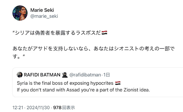 パレスチナに対する彼の支援は、あらゆる点で詐欺的であることが露呈した。 ロシアとイランはシリアを安定させるだろう。 それには数カ月かかるだろう。 シリアとその同盟国はイドリブのイスラム主義勢力の拠点を破壊する。 これには数年かかる。 イランとヒズボラの補給ラインは回復し維持される。 イスラエルは敗北する。 米国はおそらく2025年半ばにシリアから撤退する。 トルコは今後も取引相手すべてを裏切り続ける。なぜなら、エルドアンはトルコの利益しか追求していないからだ。 |